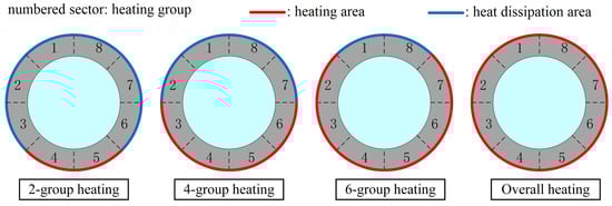 Segmented and grouped heating method; (a) 8 heating groups; (b) 3 heating segments.