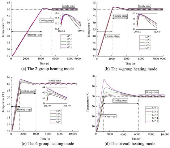 The experimental results are shown in Table 4. It can be seen that the 2-group and the 4-group heating modes had good temperature uniformity (>99%) in the heating stage and the steady state, which verifies the simulation results. The duration of heating stage of the 2-group heating mode was twice that of the 4-group heating mode, with the overall time to reach the steady state being the longest and the heating efficiency being the worst. The 4-group heating mode had the best temperature uniformity (99.23%) in the steady state. Therefore, the 4-group heating mode was selected as the preferred heating mode of the SERCT.