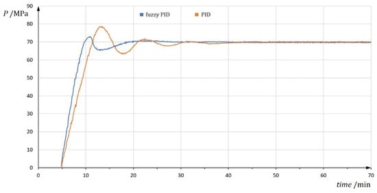 In all pressure experiments, water was distilled and boiled to minimize the impact of impurities and dissolved air in the water. Figure 13 shows the results of 70 MPa pressure test on the storage chamber of the SERCD. The internal volume of the chamber is 35.33 L. The maximum output pressure of the booster valve is 425 MPa with the flow per stroke being 3.93 mL. The simple PID control and the fuzzy-PID dual mode control were tested. The steady-state errors of both methods were less than F.S. 1%. When the PID parameters Kp, Ki and Kd of both methods were 300, 12 and 1.5, it can be seen that compared with the simple PID control, the response speed of the fuzzy-PID dual mode control was faster and the overshoot was smaller.