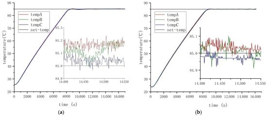 Temperature curves of heating experiments of 85 °C; (a) Fuzzy PID control; (b) Grey-prediction-based Fuzzy PID Control.