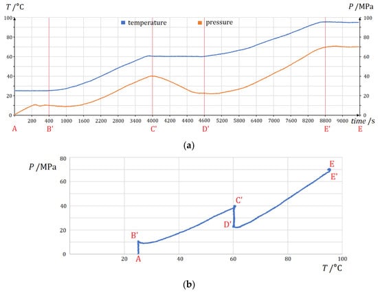 Figure 17a shows the temperature and the pressure curves during the process and Figure 17b shows the P-T curve, in which B′, C′, D′ and E′ were the real values of target points B, C, D and E, respectively. When the system was stable at points B′, C′ and D′, the temperature and pressure values were B′(25 °C, 10.1 MPa), C′(60.2 °C, 38.2 MPa), D′(60.2 °C, 22.6 MPa) and E′(95.2 °C, 68.4 MPa), respectively. It can be seen that there were errors on the control points. Besides the accuracy of the control algorithm, there were many others factors that might cause these steady-state errors; for example, the physical characteristics of water might change under different pressures and temperatures, the non-uniformity of the temperature field in the chamber might have an impact on the relationship between temperature and pressure and the actual thermal deformation of the chamber might be different from the theoretical one. To improve the accuracy of the system, after the reconstruction process reached point E′, an iso–thermal pressure fine-tuning was carried out to ensure that the system is stable at E(94.9 °C, 70.1 MPa).