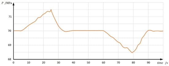 In the process of P-T preservation, the pressure and temperature changes during the push rod pushing out and retracting were examined. With the internal volume of the storage chamber being 35.33 L and the diameter of the push rod being 50 mm, according to Equation (9) when the push rod moves 10 mm each time, the pressure fluctuation can be controlled within 1.5 MPa, less than 2%. The speed of the push rod was 0.5 mm/s. The test steps were as follows: (1) let the push rod move out by 10 mm; (2) stopped the push rod and waited till the system got stable; (3) then pulled the push rod back by 10 mm; (4) stopped the push rod and waited till the system got stable again. The test was repeated 10 times. Figure 18 shows the curve obtained by averaging the pressure values of the 10 tests at 85 °C. It can be seen that the pressure fluctuation was controlled within 1.5 MPa.