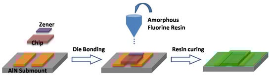 A 3.5 mm × 3.5 mm × 0.5 mm AlN ceramic submount (Hunan Tongdaxin Electronic Technology Co., Ltd.) with a Au layer on the surface was used to fabricate the DUV LED packaging device. Flip-chip LEDs (Photon Wave Co., Ltd., South Korea) with AuSn layer on the electrodes were used as the DUV light sources. The average wavelength was 274.1 nm and the average voltage was 5.8 V. Three commercial types of chips were chosen, and the sizes were 0.25 mm × 0.5 mm (Chip A), 0.5 mm × 0.5 mm (Chip B) and 1 mm × 1 mm (Chip C). A zener diode (chip integration) with a size of 0.16 mm × 0.4 mm was used as a protective element. Amorphous fluorine resin with trifluoromethyl (–CF3) ends (Ningbo Jiama Material Technology Co., Ltd., Ningbo, China) was used and dissolved in electronic fluoride solution (FC-40, 3M); the concentration of the fluorine resin was 8%. The manufacturing process is shown in Figure 1. Chip and zener diode were placed on the submountby using no-clean flux (WHP-002, Shenzhen Aoniu Technology Co., Ltd., Shenzhen, China), and then bonded to the submount with the eutectic temperature at 320 °C for 1 min. The drip coating was implemented as follows: amorphous fluorine resin solution was dripped once on the surface center of the chip by pipette, with one drop being approximately 4 μL. Then, the resin was cured by stewing at room temperature for 2 h and then for 24 h. Different thicknesses of fluorine resin film were obtained by repeating the dripping and curing process for different numbers of times.