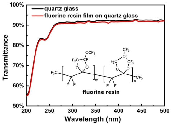 Figure 2 shows the structure and the absorption spectra of amorphous fluorine resin. The fluorine resin has a trifluoromethyl (–CF3) end, which has been shown to have a more stable performance in DUV devices [13]. To measure the absorption spectrum of amorphous fluorine resin, the fluorine resin film was fabricated on a 45 mm × 20 mm quartz glass, and the thickness of the film was approximately 40 μm. The absorption spectrum of the sample was compared with the quartz glass which had no fluorine resin film on it. As shown in Figure 2, the absorption spectra of the quartz glass with fluorine resin film were almost unchanged when the wavelength was between 200 nm and 500 nm, indicating that the fluorine resin has almost no absorption in this wavelength range.