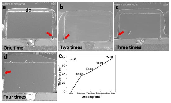 (a–d) Cross-sectional SEM image of fluorine-resin-packaged devices with different numbers of drip coatings, crack is shown by the red arrows. (e) Thickness of the fluorine resin.
