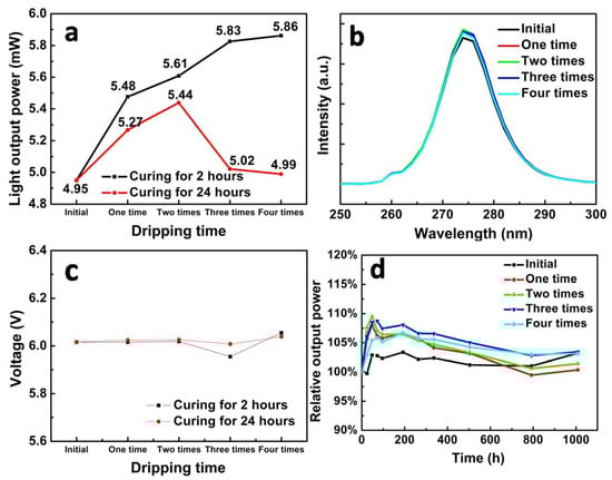 Figure 5b shows the electroluminescence (EL) spectra of the fluorine-resin-packaged device. The peak wavelength was ~275 nm, and there was no obvious shift in wavelength in the EL spectra after fluorine resin was used for packaging. Figure 5c shows the voltage of the fluorine-resin-packaged device, the voltage was around 6 V, and no significant change was observed. The results indicated that fluorine resin only affected the light output power of the device, and there was no effect on the wavelength and the voltage. Preliminary reliability tests on fluorine-resin-packaged devices are shown in Figure 5d. After aging for 1000 h, the devices were stable under a direct current (DC) mode operation current of 40 mA, and no degradation was observed. The light output power remained over 100% for all devices, better than the at least 10% decay in previous studies [15,16], indicating that fluorine resin has no influence on the lifetime characteristic under this level of light output power.