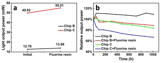 In order to verify whether the thin fluorine resin film can also be beneficial in the higher light output power of DUV LED packaging devices, Chip B and Chip C were used in the samples by dripping fluorine resin two times and the curing time was 24 h. The test current was 100 mA for Chip B and 350 mA for Chip C, respectively. The photoelectric and reliability characteristics are shown in Figure 6. As can be seen in Figure 6a, the light output power improved from 12.78 mW to 13.96 mW at 100 mA with a rise of 9.23% for Chip B, and the light output power improved from 49.82 mW to 55.01 mW at 350 mA with a rise of 10.41% for Chip C. The results prove that a ~10% enhancement of light output power can be achieved when fluorine resin is used for packaging. However, as the preliminary reliability test result shows in Figure 6b, after aging for 1000 h, the relative output power of the fluorine-resin-packaged device with Chip B decayed by 11.26% at 100 mA, while no decay was observed in the devices without fluorine resin at the same current. At the same time, the reduction was 16.99% for Chip C with fluorine resin compared with bare Chip C at 350 mA. This result may have been caused by DUV-induced photolysis related to the two oxygen atoms in the five-membered ring [14].When the light output power is 12 mW or larger, obvious decay is observed, the fluorine resin material is still unstable for high-power DUV applications.