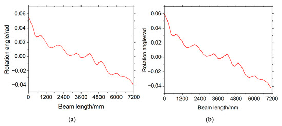 Equation (4) can be used to solve the section rotation angle of the structural edge deflection (Figure 15b). Furthermore, the obtained section rotation angle can be the elimination condition for the multi-point displacement mismatch. Figure 16 shows the calculation results for the test beam’s edge rotation angle.