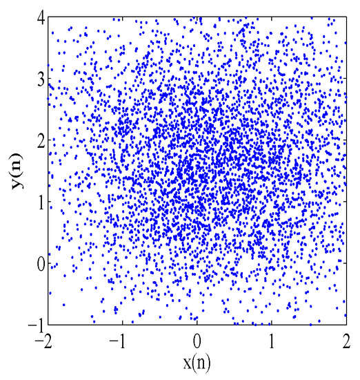 Based on the observations from the three different fractional chaotic maps obtained from the literature, this section depicts the chaotic response of the novel discrete fractional map proposed in (8). The proposed DFSCM exhibits highly non-linear behaviour, and the chaotic response of the map (8) is visualised in the comparison with the three other discrete fractional maps from the literature in Figure 2. The long-term behaviour of the system ensures the suitability of the system to be employed for cryptosystems, and the randomness of the state variables is exhibited in the form of the phase portrait plane in Figure 3. The phase portrait plane also visualises the trajectories distributed at a highly random level. The main advantages of the proposed DFSCM are the long-term chaotic behaviour, which ensures complexity, and the improved chances of generating a highly secure secret key based on the DFSCM (8).