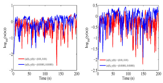An important aspect of the chaos theory is the sensitiveness to the change in initial conditions of the map. This section investigates the sensitivity of the chaotic map (8) with initial conditions and for the parameters , and , respectively. Numerical simulation is presented in Figure 4.