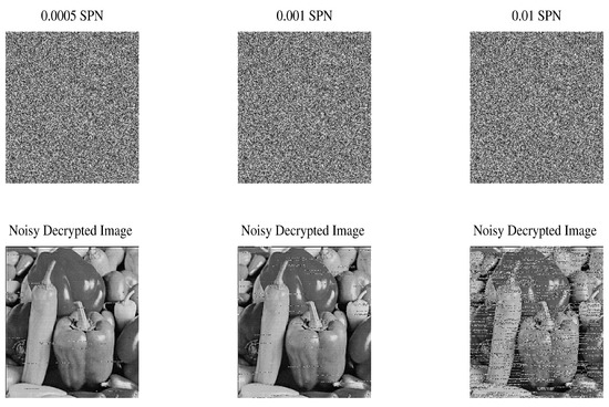 where and represent the original and decrypted image, respectively. MSE denotes the mean squared error. The similarity of the images restored after the attack with the input image is presented with the MSSIM (multi-scale structural similarity index method). The MSSIM actually provides information on the deformity of the decrypted image due to the attack. Noise affects the quality of the image, reducing the quality of the decrypted image obtained after the Spn attack under different intensities on the encrypted image for different images, and is calculated in the form of PSNR and MSSIM, as shown in Table 9. Spn at intensities and are employed, and the changes in the decrypted images are visualised in Figure 13. Typical PSNR values for an image with good quality are around 30–50 dB. The tabulated PSNR values for the different images clearly lie within the range, and thus, it is evident that our algorithm is capable of withstanding the Spn noise attack and recovering the image with good quality.