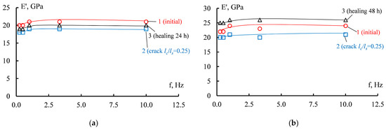 Figure 7 shows the curves of E’ versus f for samples of CFRP based on a binder with a self-healing effect with a relative crack length of 0.25 for different times of the self-healing process at 80 °C exposure. It can be seen that the values of the modulus of elasticity E’ CFRP after heat treatment (curve 3) are higher than the values of E’ after cracking (curve 2) and approach the level of the modulus of elasticity for CFRP samples without a notch (curve 1).