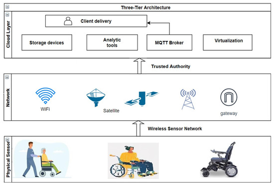 The term “Internet of Things” (IoT) refers to enormous networks that combine the Internet with a variety of sensing technologies, to achieve the connection of people, machines, and things at whichever time and at any location, which has become crucial in the age of information. Wireless sensor systems are managed by connecting small nodes [10] or devices through Zigbee, Bluetooth, or WiFi. The IoT in smart cities can have various futuristic applications, especially in healthcare and assistive technology. One such application is the development of intelligent wheelchairs that utilize WSNs for tracking and monitoring the location and movements of the wheelchair user. This can aid in providing better assistance and care for people with mobility impairments, as presented in Figure 1. Smart wheelchairs with sensing abilities are intended to offer universal connectivity using cloud and edge computing technology.