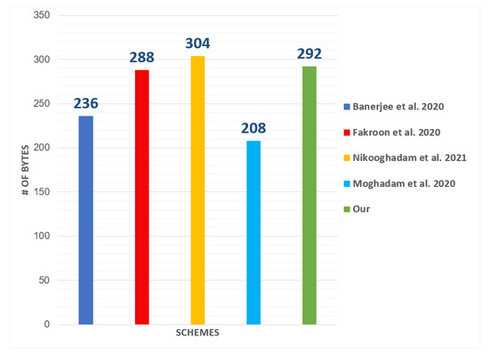 The estimated cost of communication is shown in Table 7. For comparison, the size of the identities is assumed to be 16 bytes long, timestamps to be 4 bytes long, SHA-1 hash outputs to be 20 bytes long [53], the cost for an ECC point is bytes, random numbers to be 20 bytes long, and the symmetric encryption/decryption block size is 16 bytes [54,55]. Figure 6 also displays the communication costs of the various protocols.