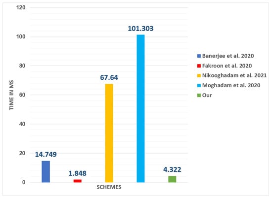 This part evaluates the cost of computation for the various schemes. The computation times for the ECC multiplication, symmetric encryption/decryption, fuzzy extractor, bilinear pairing, and hash are , , , , and ms, respectively, where as explained in [49]. Table 8 also demonstrates the estimated time frames required for specific cryptographic operations and associated notations.