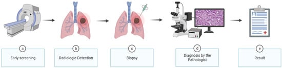 The process for the detection begins with radiologic techniques such as a chest X-ray, computed tomography, or magnetic resonance imaging (Figure 1a). If malignant tissue is suspected (Figure 1b), a biopsy is performed to obtain material for histopathological examination (Figure 1c). Formalin-fixed paraffin-embedded tissues are processed to create glass slides that are routinely stained with hematoxylin and eosin. Pathologists analyze these glass slides through either a brightfield microscope or a whole-slide image (WSI), which is a high-resolution digital scan of a microscopic slide that allows for counting, measuring the sizes and densities of objects, and applying image processing algorithms to detect lesions or cancer (Figure 1d). Finally, the exam results are communicated to the patient (Figure 1e) []. While the process seems simple, histological evaluation can be time-consuming, requires a high level of precision, and should be performed in the early stages of cancer to allow for more treatment options [,].
