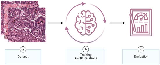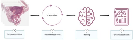 The starting point for developing a novel algorithm for histopathological lung cancer detection is the acquisition of lung WSIs (Figure 3a). Then, the dataset would be prepared, that is, annotated by pathologists, where the annotated regions are extracted from the WSIs, generating a new dataset that undergoes operations to balance, augment, or split the dataset (Figure 3b). Once the dataset is prepared, it is used to feed the neural networks during the training and validation processes (Figure 3c). At the end of the experiment, the model performance according to the defined metrics is shown (Figure 3d).