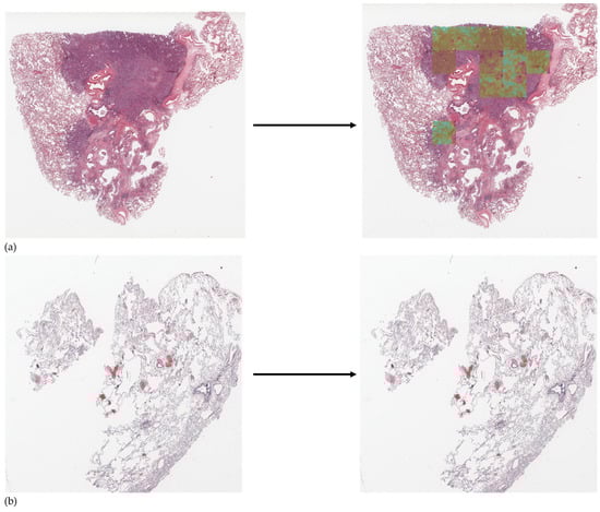 Among the NLST and TCGA datasets [,], NLST had a higher number of WSIs available and, for that reason, was selected for annotation and training. A total of 117 WSIs from the NLST repository were annotated by the pathologist (S.C.) (Figure 4).