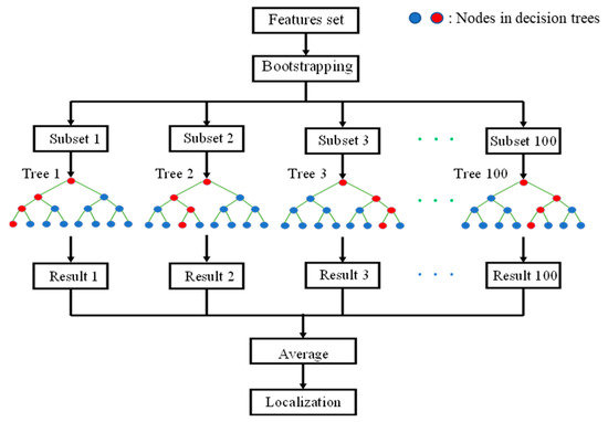 In this study, both linear regression and random forest algorithms were applied to predict impact locations based on AE features. The performance of each method was compared using various evaluation metrics, such as the coefficient of determination (R2) and root-mean-squared error (RMSE) [39]. This comparison aids in the determination of the most suitable model for prediction of impact locations in this specific context. Figure 2 presents the structure of a random forest regression model with 100 decision trees. The color circles in the figure refers to the node of decision trees.