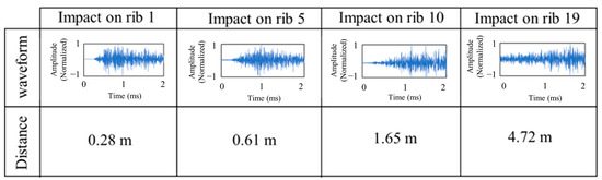 The impact experiment setup is shown in Figure 3. An experimental setup involving a steel sphere impacting the elevator specimen was employed to assess the proposed impact localization system. The steel sphere, with a diameter of 0.013 m and a weight of 8.4 g, was consistently positioned at 0.61 m from the elevator’s surface for all impacts. The impact energy was maintained at 0.05 J, with all variables remaining constant except the impact location. A guide tube was utilized to regulate the location and height of each impact. The elevator featured 20 ribs, with one distinct impact point on each rib. An acoustic emission (AE) sensor was affixed to the elevator’s spar near the location of the vertical stabilizer. This location was chosen to minimize cabling in the aircraft. Each impact location was subjected to 60 impacts, resulting in a total of 1200 impacts. AE signals were recorded by an acquisition system throughout the experiment. The dimensions, material of the elevator, and the locations of the sensor and impact are presented in Figure 4. It should be noted that in the rest of the paper, “rib number” is used as the label for linear regression and random forest models. This “rib numbering” refers to the listing of the ribs in Figure 4, starting from left to right.