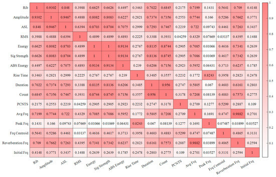 As mentioned in the previous section, the AE signals for this study were obtained from an AE acquisition system during steel sphere impact testing. Figure 5 presents four typical AE signal waveforms recorded in the impact experiment. The difference in the AE waveform pattern can be related to the difference in the impact location and the distance between the sensors. AE signals were subsequently processed to extract relevant features from the AE waveform. The purpose of extracting these features was to distill the complex information embedded within the signal into a set of specific, representative values that effectively capture the properties of the AE signal. In the present study, a total of 15 key features, including count, signal strength, and reverberation frequency, were derived from the initial signal. Count refers to the number of threshold crossings in the AE signal. In simpler terms, it is a measure of how many times the signal goes beyond a certain predefined limit, which can indicate the intensity of the emission. Signal strength is essentially the integral of the rectified voltage signal over the waveform duration. It provides a quantitative measure of the overall “energy” present in the AE signal. This feature is essential in understanding the severity of the impact or event causing the emission. Reverberation frequency is the frequency after the peak of the AE signal. Essentially, it is the dominant frequency that persists after the initial, most intense portion of the signal has passed. This feature can provide insights into the nature of the event causing the emission, as different events can have different reverberation characteristics.