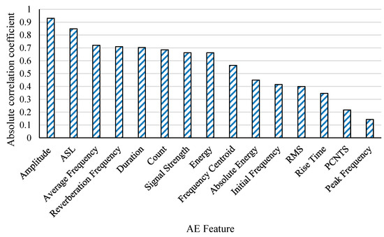 The correlation coefficients presented between the features and the label offer critical insights into the relationships that may be leveraged when selecting features for a linear regression model. In developing an accurate and reliable model, it is essential to select features that exhibit a strong correlation with the label, while minimizing multicollinearity among the selected features. The absolute values of the correlation coefficients between the impact location and the 15 AE features are shown in Figure 7. All correlation coefficients are arranged in ascending order.