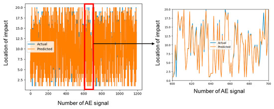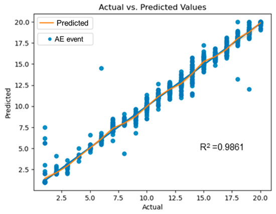 Upon optimizing the number of decision trees, the AE dataset, consisting of 15 features, was incorporated into the random forest model as input. The dataset was partitioned using a 70/30 training/testing ratio to ensure a robust evaluation of the performance. The results demonstrated a high level of accuracy, indicating that the model is well suited for the given task. Figure 8 illustrates a comparison of the actual impact locations with their corresponding predicted impact locations derived from the model. The R2 value, equal to 0.98616, signifies a good fit between the predictions and the actual labels. This suggests that the model is adept at accurately capturing the underlying relationships between the predictor variables and the response variable.