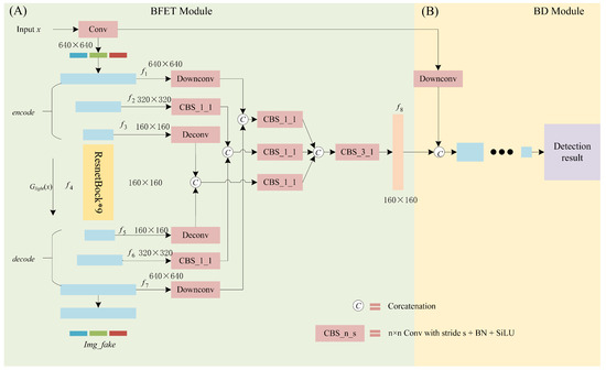 Network structure model architecture. (A) is the BFET module to translate the image from low-light to hight-light and enhance the features of the blastholes. Features – are the encoded feature maps to extracted low-light image features from x; – are the decoded feature maps that tranlate the low-light features into hight-light features. (B) is the BD module, which is used to detect the feature maps generated by (A).