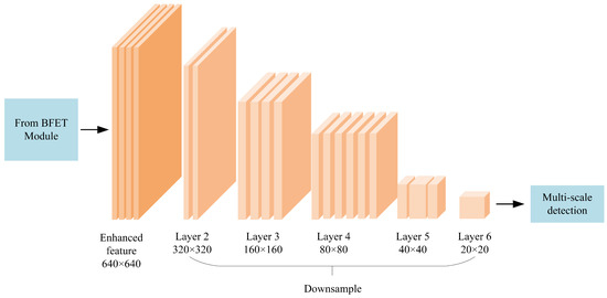 The proposed BD module extracts the enhanced fused image features. The main feature of this module is that after fusing the image features under low- and high-light conditions, a single-cycle network is formed by cascading the input feature images. The fused feature image extracted by the BFET module is directly used as the input to the BD module, instead of the RGB image. The entire network realizes end-to-end training and detection, reducing the number of network layers and the computing time. As can be seen from Figure 1, part (B) is the BD module, which can be based on the YOLOv3 [22], SSD [23], RetinaNet [24], YOLOv5 [25], YOLOv7 [26], or YOLOv7-tiny networks. As shown in Figure 2, we take the YOLOv7-related framework into this module for detection, with 640 × 640 RGB images as the input. This method adopts Resnet-9 as the backbone for feature extraction, and three layers of feature maps with different sizes are output after the head. The minimum feature scale is 20 × 20, which is 1/32 of the input size. CBS is mainly composed of Conv+BN+SiLU, n = 3 and stride = 2. ELAN in YOLOv7 consists of multiple CBSs so that its input and output feature sizes remain constant. After the last CBS output for the desired channel, the reduced RGB image is replaced with the fused feature image.