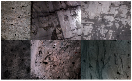 The image acquisition of roadway working faces is primarily performed using an intrinsically safe explosion-proof camera model ZHS2420 and an intrinsically safe KTW280 explosion-proof cellphone. The camera has a maximum resolution of 6000 × 4000, while the cellphone has a maximum resolution of 2340 × 1080. To ensure the reliability of the blasthole image detection algorithm in roadway working faces, we collected an image dataset from the No. 15121 air inlet and bottom extraction roadway of the Sijiazhuang Company of the Shanxi Yangmei Group. This dataset, named CUMTB-BI, was acquired with an intrinsically safe explosion-proof camera equipped with a new landmark intrinsically safe LED flash. It contains 3620 blasthole images with an original resolution of 1080 × 720. In the experiment, we adjusted the images to 640 × 640 after down-sampling. Figure 4 shows some samples collected in complex background conditions.