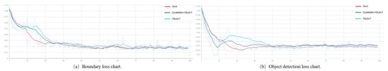 During the experiment, we selected 2500 randomly as the training set and 500 as the test set. The relevant parameters were set as follows: epoch = 100, bach_size = 16, input image size 640 × 640, learning rate = 0.0002, and the optimizer was Adam. Figure 5 compares the training results of different methods. The method of YOLOv7+BFET-BD can better detect blastholes in the dataset. The bounding box loss and object detection loss are also reduced accordingly.
