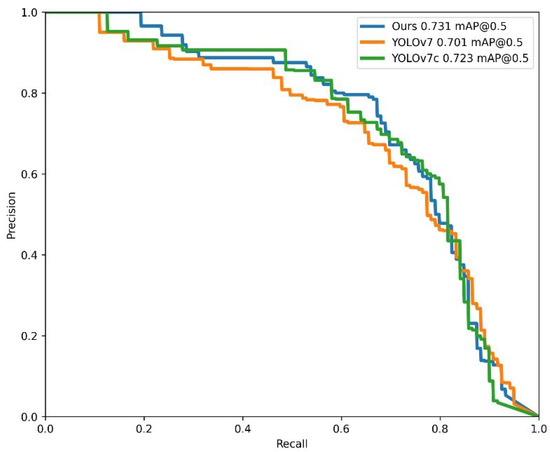 Figure 6 shows the precision–recall (PR) curves for several different methods on the blasthole dataset. It can be seen that the detection effect of the method proposed in this paper is better than the effect of using YOLOv7 detection after enhancing the dataset image and directly inputting YOLOv7 by comparing the area under the curve. The mAP@0.5 in this study reached 0.731.