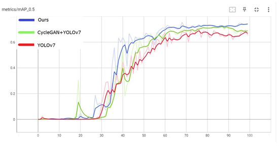 Table 1 shows the performance comparison of the original dataset detection, CycleGAN-enhanced dataset detection and detection using the algorithm of this work. Figure 7 shows the comparison of the mAP for each method.