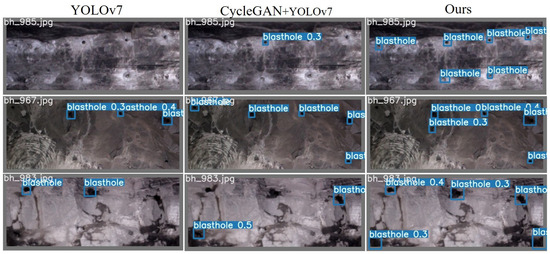 We randomly selected images from the dataset to directly detect blastholes, to detect blastholes after CycleGAN enhancement and to use this method to detect blastholes. The results are shown in Figure 8. The three typical images selected from all the detection images as object detection results are very representative and effective. The results show that the method proposed in this paper greatly improves the processing of blasthole detection in low-light conditions and under low contrast.