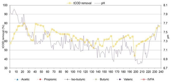 In terms of the concentration of organic acid, the following was observed. Acetic acid varied between 17.2 and 680 mg/L and tSCFA between 20.1 and 2101 mg/L. It was also noted that there were periods when propionic, iso-butyric, butyric and valeric acids were not detected, while the highest concentrations were 1938, 119, 126, and 112 mg/L, respectively.