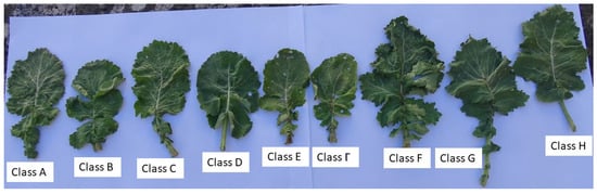 Pictures of leaves of the investigated landraces. Legend: Mugnoli Broccoli A (Class A), Mugnoli Broccoli B (Class B), Mugnoli Broccoli C (C), Guardiagrele Turnip (Class D), curly kale from Lama dei Peligni (Class E), Rapa senza testa (Class Γ), Cima dell’Osento (Class F), Cima 90° San Marzano (Class G), and Cima Grande (Class H).