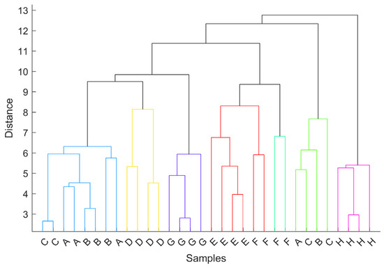 Hierarchical clustering using average linkage of the morphological descriptors. Legend: Mugnoli Broccoli A (Class A), Mugnoli Broccoli B (Class B), Mugnoli Broccoli C (C), Guardiagrele Turnip (Class D), curly kale from Lama dei Peligni (Class E), Cima dell’Osento (Class F), Cima 90° San Marzano (Class G), and Cima Grande (Class H).