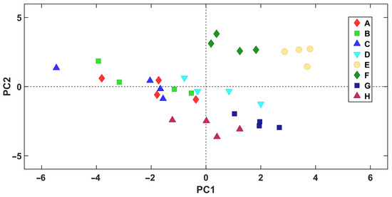 The score plot (Figure 4) demonstrates how the samples are distributed in the space of the first two principal components (PC1 and PC2). Although this representation takes into account only part of the variance explained by the model, it is feasible to spot distinct grouping tendencies among samples belonging to the same population. Indeed, the mugnoli fall all together at negative PC1, showing a relevant degree of overlapping. Moreover, they are very close to samples belonging to Class D, in agreement with the hierarchical cluster analysis. Plants belonging to Classes G and H present positive or slightly negative values of PC1 but can be distinguished from all the other individuals along PC2, where they fall at negative values. Samples belonging to Classes E and F fall at positive values of both PCs, showing similar behavior, reflecting the similarity already pointed out by cluster analysis.