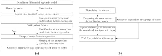 The modal state residualisation process is summarised in Figure 3b, where it is seen that the obtained is specific to the chosen output-input couple (). In other words, the obtained reduced models can be different for each considered test case: observed variables-output/simulated event-input. It follows that the method is flexible and can be adapted to any considered events and concerned variables (e.g., converter current).