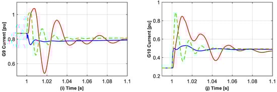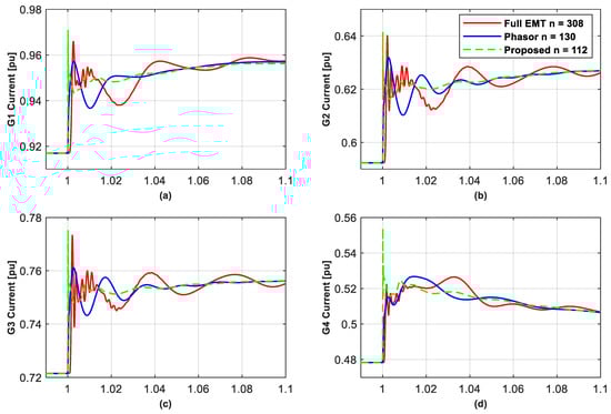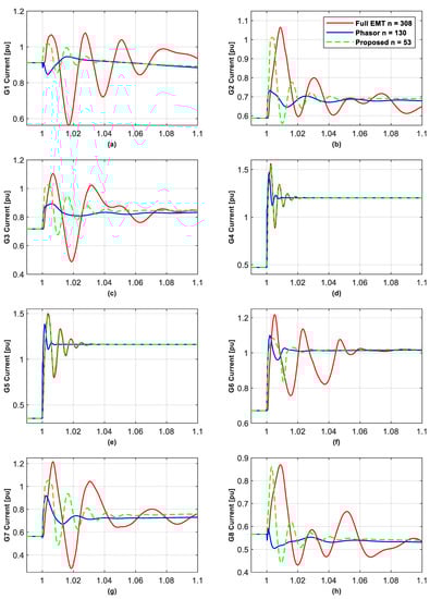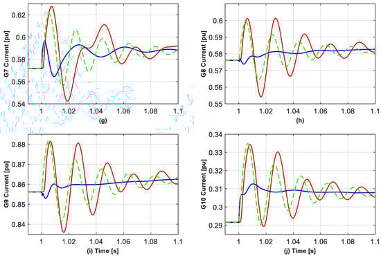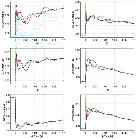 For Cases 1–3, comparison simulation results of the 10 GFM currents are shown in Figure 5, Figure 6 and Figure 7, respectively, noting that a different reduced model should be used for each simulated event. Figure 5, Figure 6 and Figure 7 show that by choosing the model order to be the same as the phasor approximate model, that the reduced models better capture the GFM transients (as they retain the most relevant dynamics) over the RMS models. More precisely, the reduced models accurately simulate the GFMs that are the most impacted by the short-circuit and line-tripping events, i.e., G4 and G5 for Cases 1 and 2, and G9 for Case 3, while the phasor models miss the initial current peaks, and so would suggest that the converter current was within acceptable limits, when, in fact, it was not. For the other GFMs in Cases 1 and 2, the reduced models also capture the transients of the first peak current of the converters with better accuracy than the phasor approximated models, except G6 in Case 1 where the first peak current of G6 is slightly lower than with the phasor model. It is seen that the former correctly predict the trends of the first oscillation of the converter’s current with much smaller first peak errors, while the latter sometimes gives opposite directions for the first oscillations (for example for G1, G8 and G9 in Case 1) and tends to have a larger error for the first peak (e.g., the error is 0.1~0.3 pu for G2, G3, G7, and G10 in Case 1). Similarly, in Case 3, for the other GFMs, i.e., not G9, the low-frequency current oscillations in the full EMT model are better matched by the reduced model over the phasor model, although they both miss the first peaks, as seen in Figure 7, where in the phasor model the phases of the low-frequency oscillations are almost opposite to those in the full EMT model.