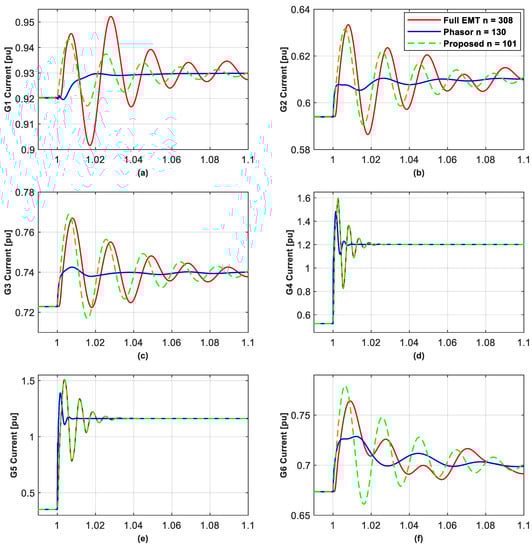 Figure 8 and Figure 9 show that the critical poles (i.e., rightmost poles that dominate the system transients) of the reduced models are well overlapped with those of the full EMT model, while the phasor models fail to represent the unstable poles 0.3 (participation factor calculations show that the two unstable poles are mainly contributed by and of G3 and G4 (95%)) and critical oscillation modes.