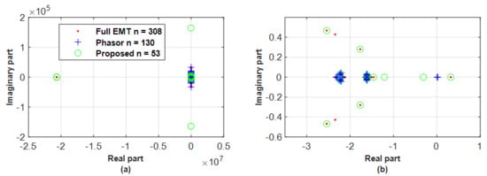 (a) Poles of linearised full EMT, phasor, and proposed reduced model, for a 150 ms short-circuit applied at bus 16 at 1 s under Case 2, and (b) zoomed figure.
