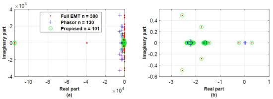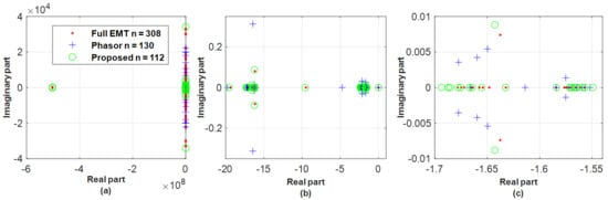 Figure 8, Figure 9 and Figure 10 compare the poles of the linearised EMT, phasor, and reduced model of the faulted systems for Cases 1–3, respectively. The linearised A matrix is obtained by using the Linearize tool in Dymola software, which performs a linearisation based on the real-time operating point at a specific time point. The time point is set immediately after an event is applied, and hence the impact of the simulation event as an input can be captured in the linearised model. Note that the aim of presenting Figure 8, Figure 9 and Figure 10 is not to conduct detailed small-signal analysis but to show the match degree of the reduced and phasor models to the full EMT model.