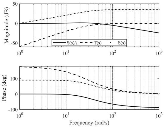A comparison between Equations (13) and (24) reveals that they share many similarities in their forms, with the main difference being the location of the part . In the case of the CF, the part is present in the numerator of the angular rate transfer function. However, for ESO, the part is in the numerator of the model information transfer function. By setting the observer bandwidth to and choosing and , the Bode diagrams of the CF and ESO are compared in Figure 4.