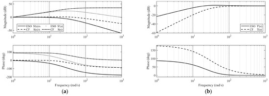 Bode diagrams of CF- and ESO-based filters: (a) Transfer function S(s) plots and (b) Transfer function T(s) plots.