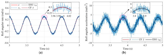 Time–domain analysis of CF- and ESO-based filters: (a) Angular rate estimation comparison and (b) Angular acceleration estimation comparison.
