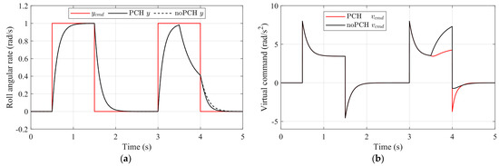 Roll mode dynamic simulation results with and without PCH: (a) Roll angular rate comparison and (b) Virtual control commands comparison.