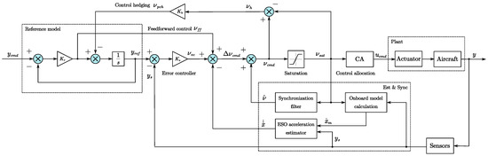 The inner loop is responsible for controlling the roll and yaw angular rates, which are the main control objectives. Building upon the previous research, the overall control structure is depicted in Figure 9. It can be observed that the control structure comprises five key components: the reference model, error controller, angular acceleration estimation, control synchronization, and control allocation. While the aforementioned sections focused on discussing the former four components, the latter (control allocation) will be addressed separately.