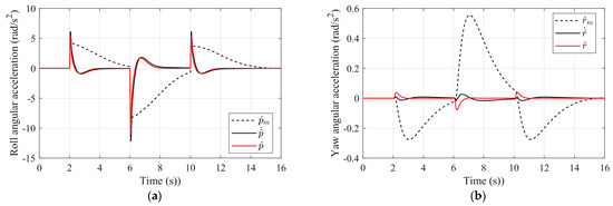 It is worth highlighting that the angular acceleration input to the ESO, which is computed using the mathematical model, also needs to be synchronized. To achieve this, Equation (23) can be referenced, and the response delay caused by the physical actuator must be taken into account. To this end, the estimated actuator model is applied to the mathematically calculated results, as shown below: