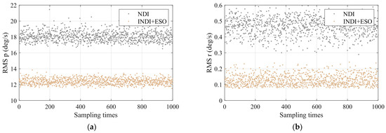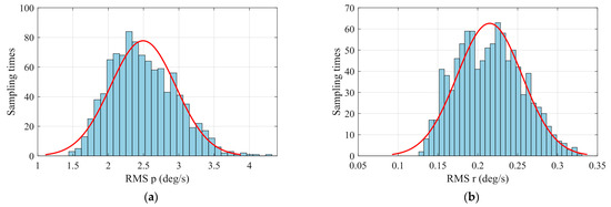where p is the roll angular rate; is the aileron deflection angle; and and are the roll control parameter and damping parameter, respectively. The roll angular rate is measured by a gyroscope with its noise and bias [32]. The aileron deflection angle is modeled as a sine function and can be expressed as